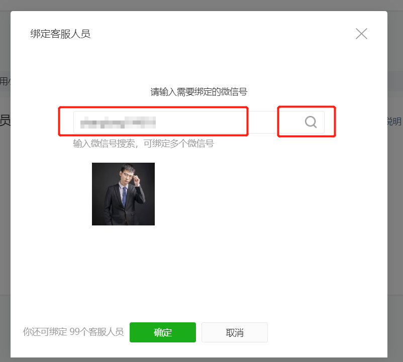 4.點(diǎn)擊添加客服按鈕后,我們需要輸入我們客服人員的微信號(hào),然后點(diǎn)擊右側(cè)的放大鏡圖標(biāo)搜索,在點(diǎn)擊確定按鈕,客服就綁定成功了。